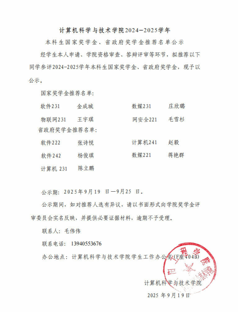 计算机学院2024-2025学年国家奖学金推荐人选公示